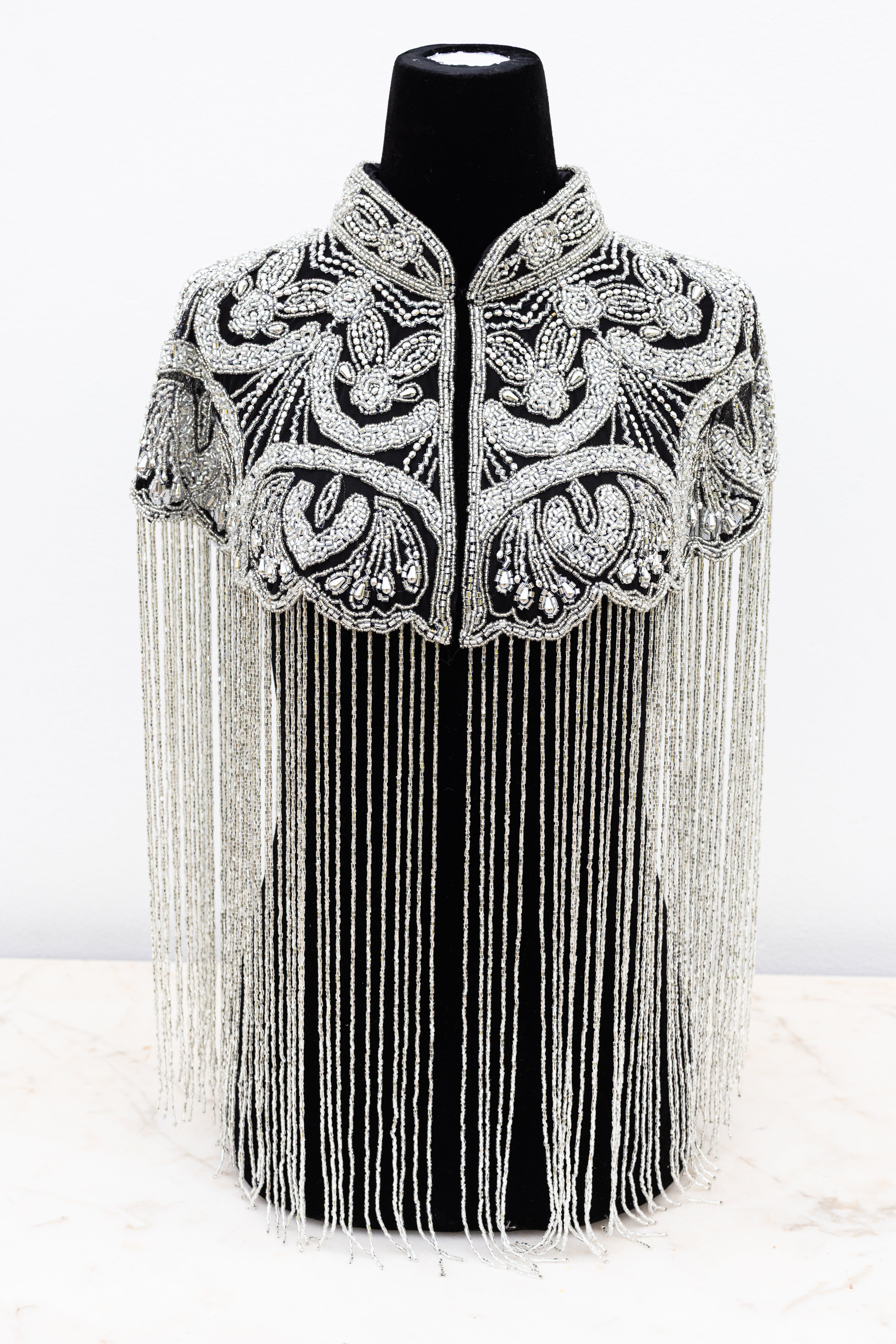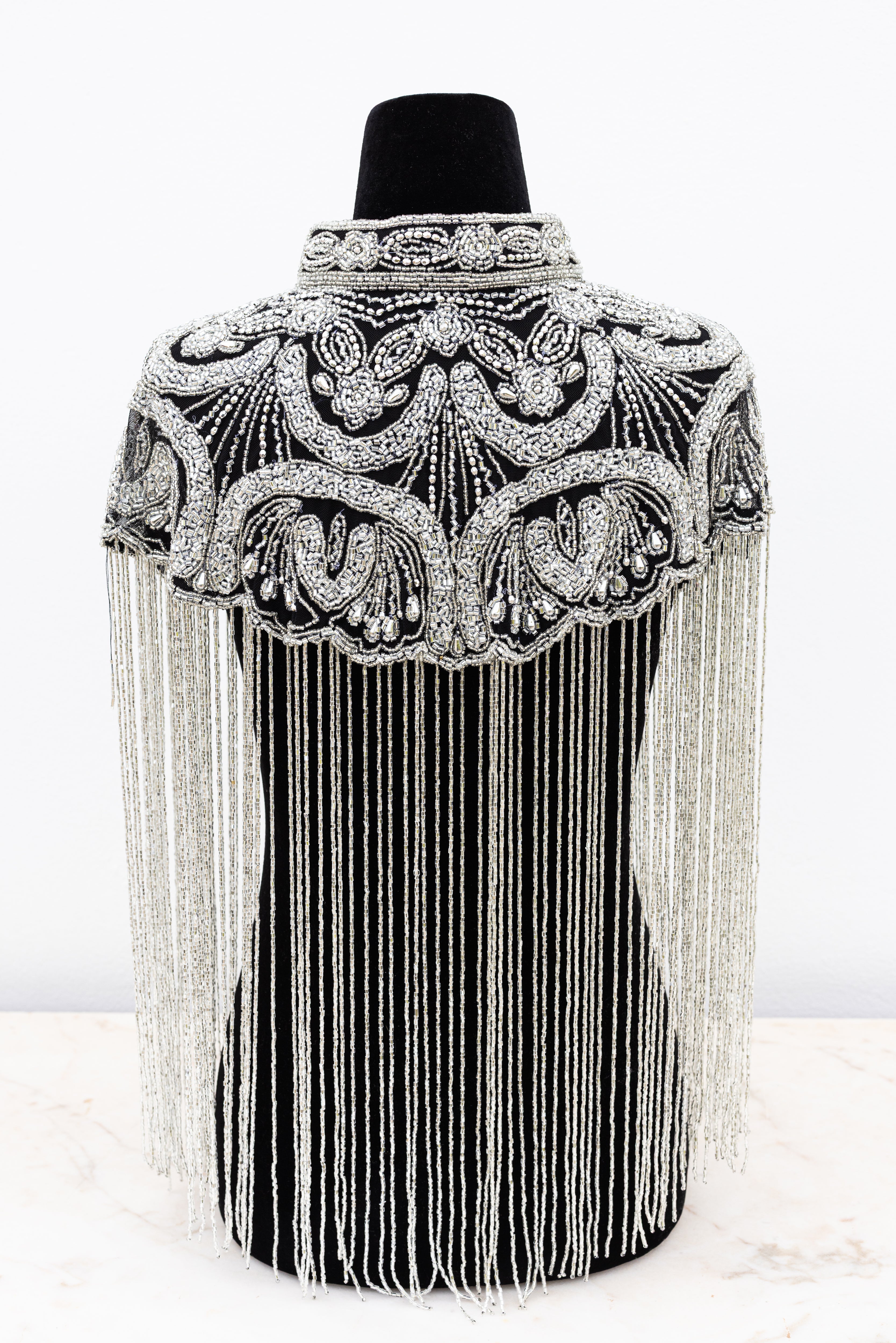 Adorned with shimmering glass beads, this unique one-size cape captures the essence of glamorous disco nights and festival elegance. Perfect for effortlessly dressing up or down, it adds radiant sparkle to any look.