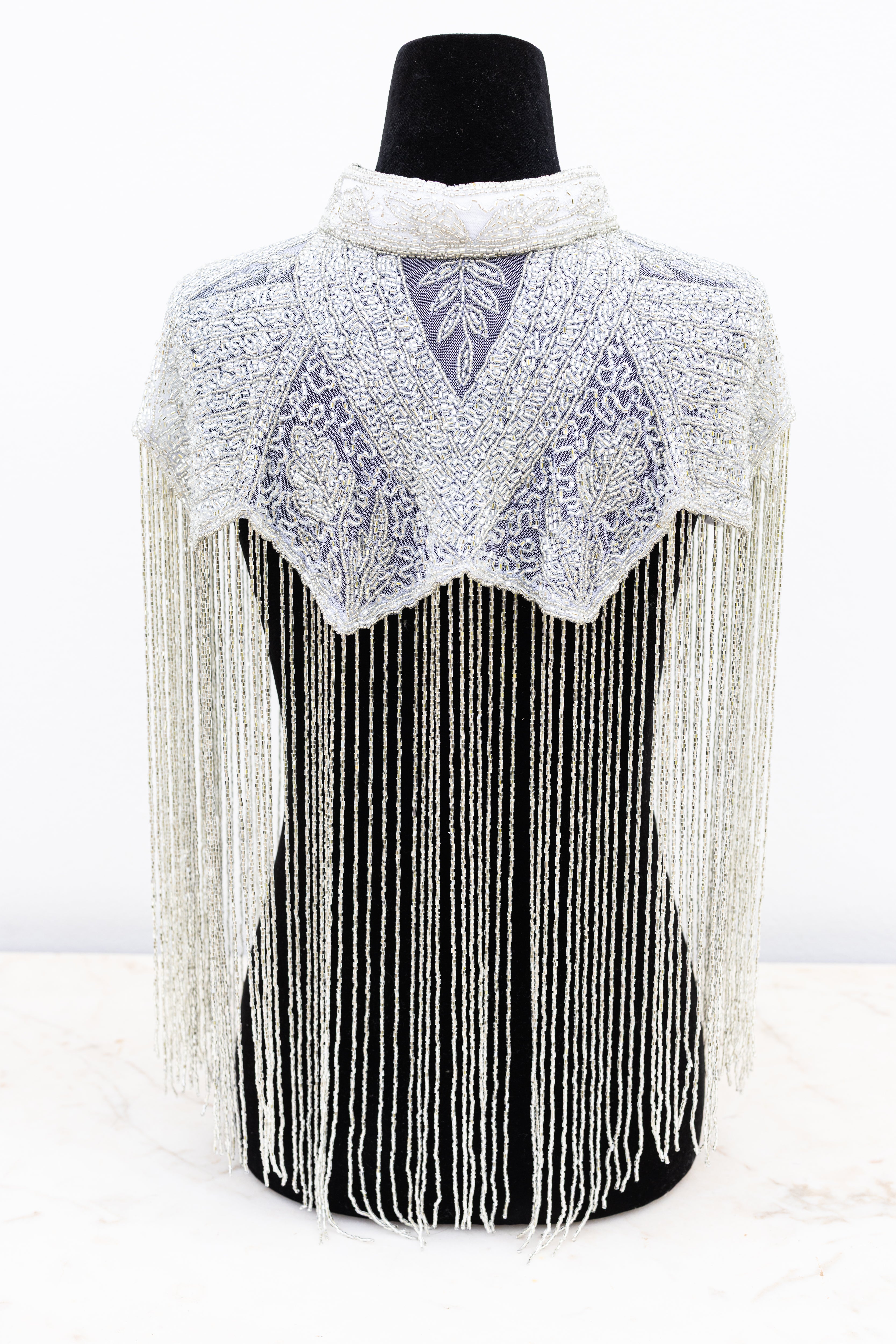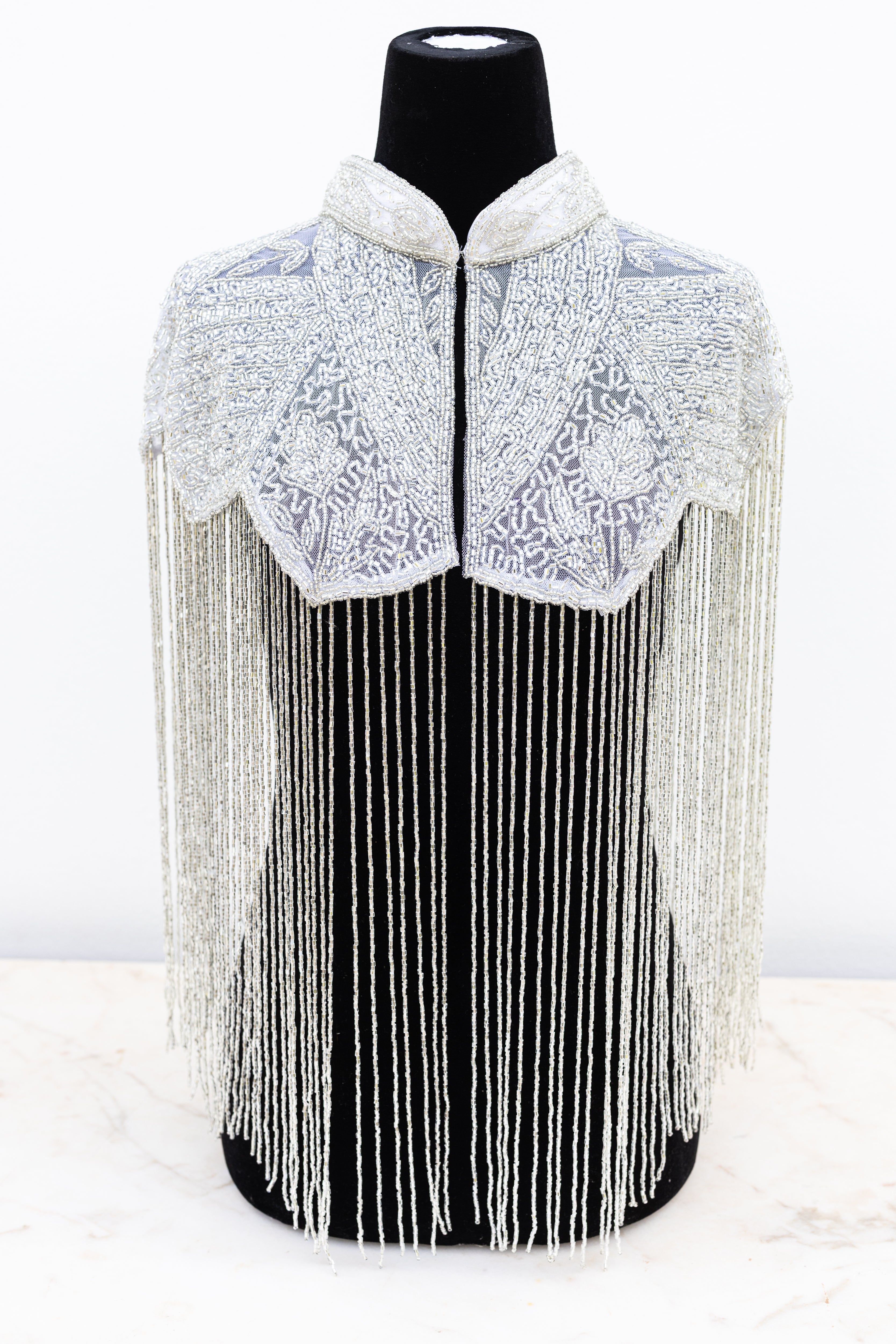 Adorned with shimmering glass beads, this unique one-size cape captures the essence of glamorous disco nights and festival elegance. Perfect for effortlessly dressing up or down, it adds radiant sparkle to any look.
